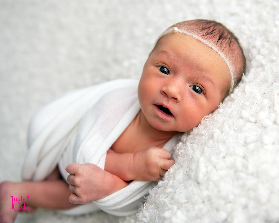 Une jolie demoiselle qui est demeurée éveillée une bonne partie de la séance photo! Qu’à cela ne tienne: on photographiera ses beaux yeux!